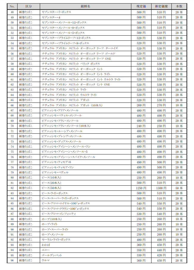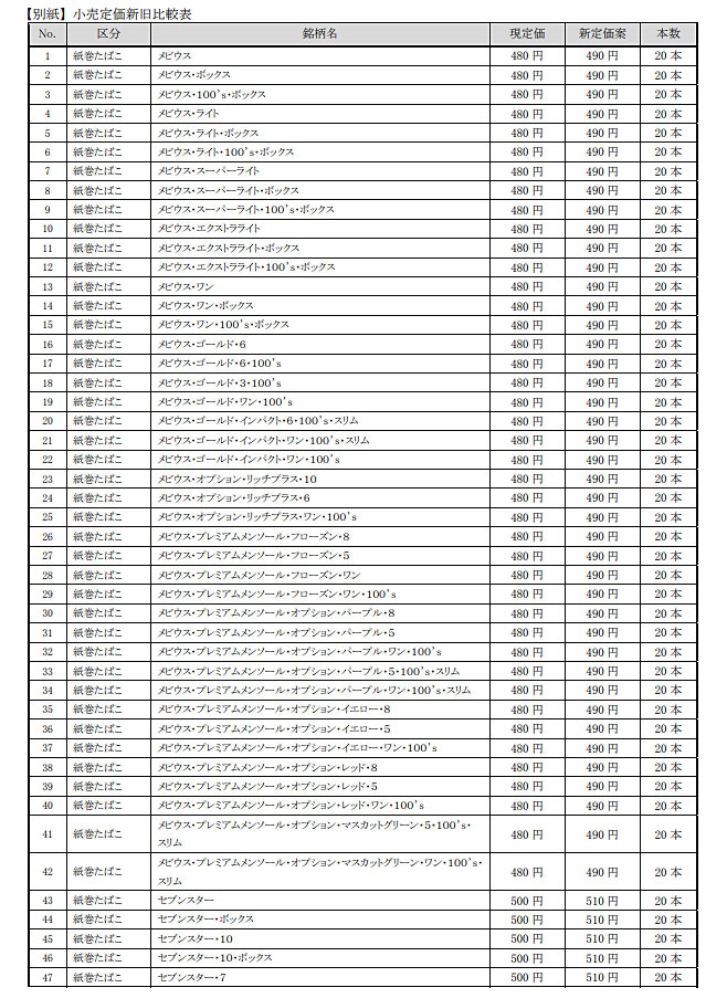 一部銘柄は据え置くものの、「メビウス」が現行の480円から490円に、「セブンスター」「ピース(20本入り)」が500円から510円に、
