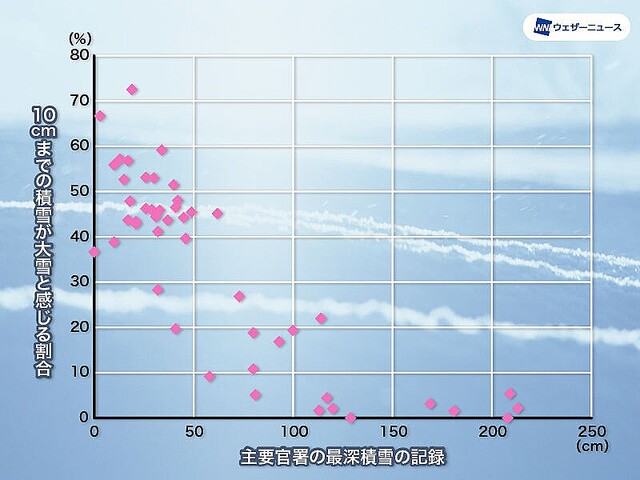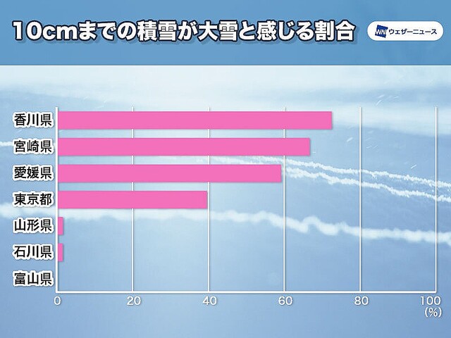 東京では積雪10cm程度までに大雪と感じる人が40%近くにのぼった。豪雪地帯でも傾向は様々で、特に新潟県は「30cmが大雪」と回答した割合が最も高いものの、県内でばらつきが多かったという。 pic.twitter.com/0Dj0k8SROf